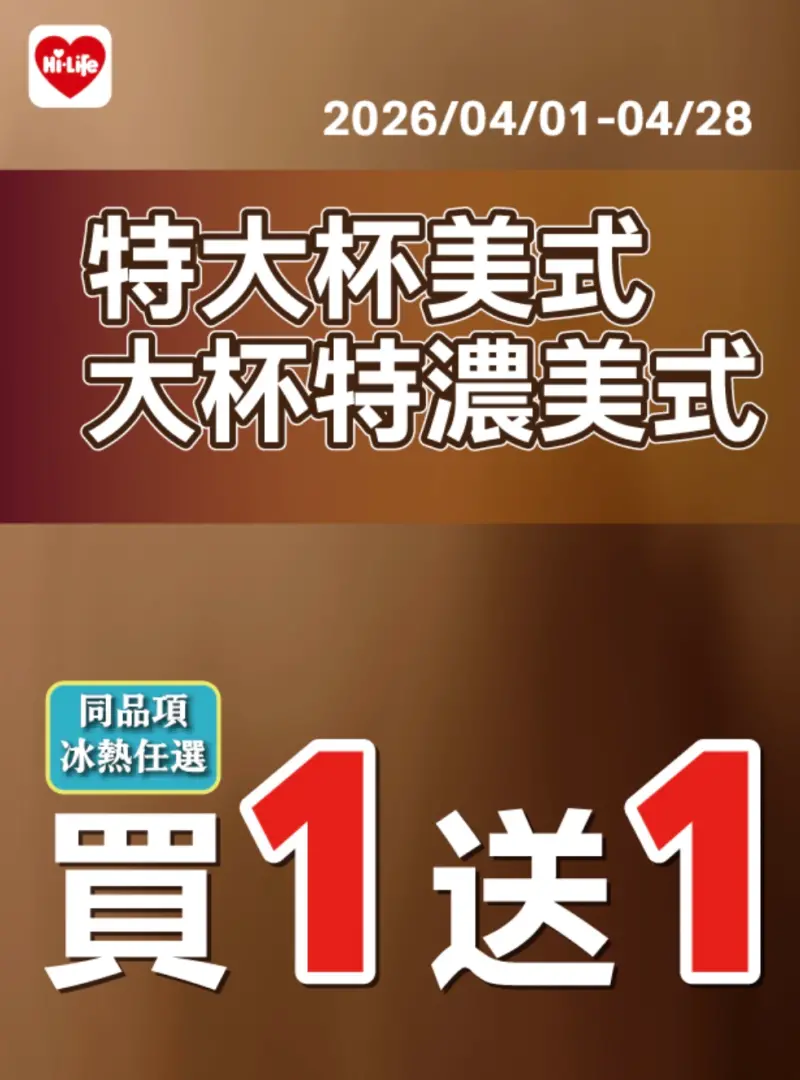 ◾大杯特濃美式買1送1,5折(原價65元、特價33元)