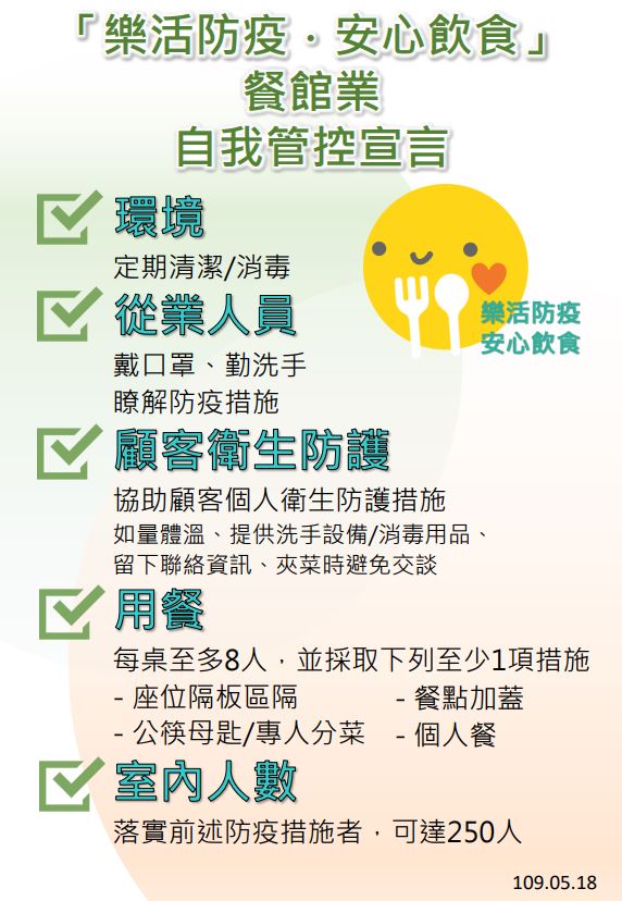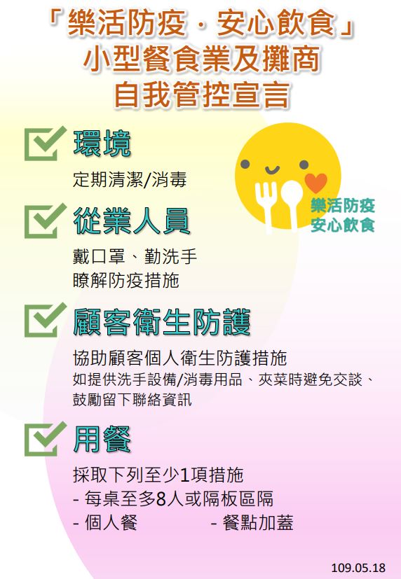 配合「嚴重特殊傳染性肺炎中央流行疫情指揮中心」防疫新生活政策,食藥署推動「樂活防疫.安心飲食」運動,並製作「『樂活防疫.安心飲食』自我管控宣言」單張,提供餐飲業者在自主確認落實防疫措施後,可於店內張貼宣言單張,並鼓勵消費者安心用餐。
