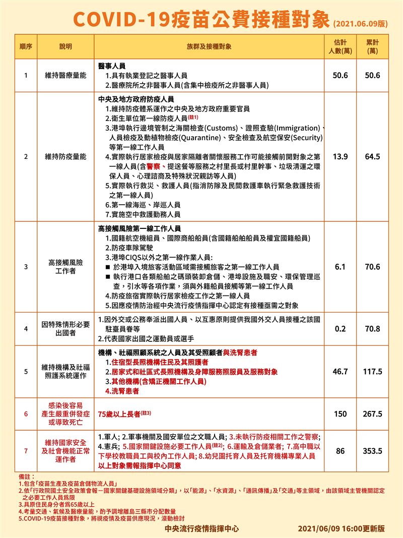 疫情指揮中心指揮官9日公布最新公費COVID-19疫苗接種名單。(指揮中心提供)